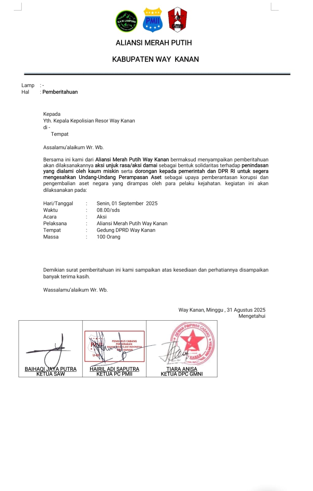 Way Kanan – Sehubungan dengan beredarnya surat pemberitahuan aksi yang beredar di publik, bersama ini kami dari Aliansi Merah Putih menyampaikan klarifikasi sebagai berikut: